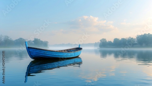 © Artem, Naklejka premium Solitary blue boat on tranquil reflective waters