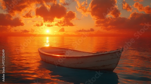 © ATVPEDIA ID, Fototapeta premium Solitary boat at sunset on calm ocean.