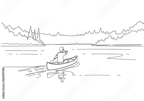 © Muhammad, Fototapeta premium Solitary Canoe Journey on a Serene Forest Lake – Hand-Drawn Black and White Sketch