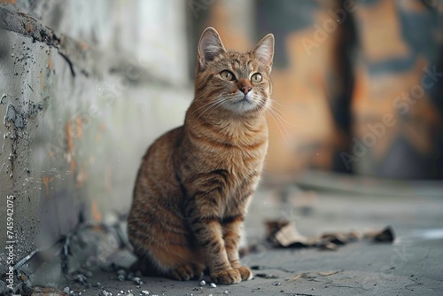 Naklejka premium Solitary cat perched on rooms cement floor, contemplative solitude captured