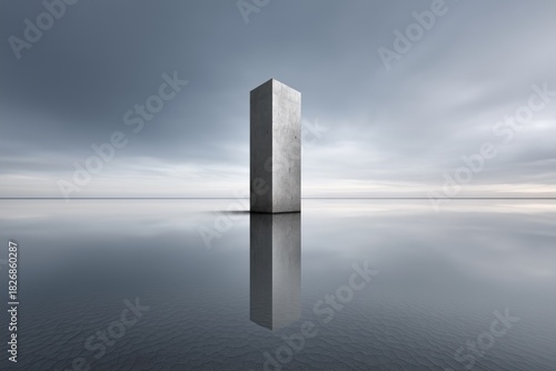 © id512, Obraz premium Solitary concrete monolith rising from still water under dramatic sky, abstract metaphor for ambition, growth and inner stability