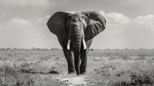© pkproject, Naklejka premium Solitary Elephant Traversing the Savanna in Monochrome