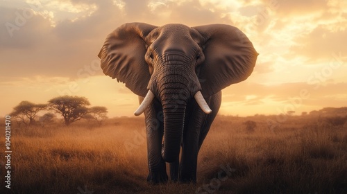 Obraz premium Solitary elephant under a peaceful golden sky