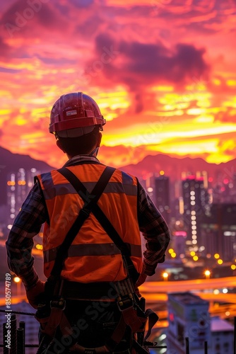 © Ilja, Obraz premium Solitary engineer at twilight silhouetted figure on skyscraper with city lights reflected in helmet
