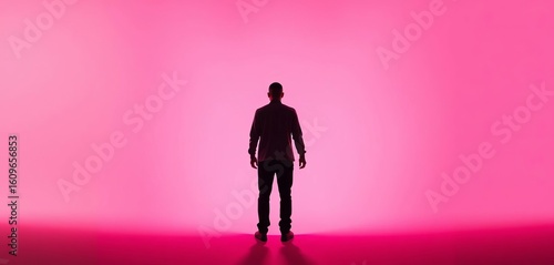 Fototapeta premium Solitary figure, back to camera, against bright background, white, human form