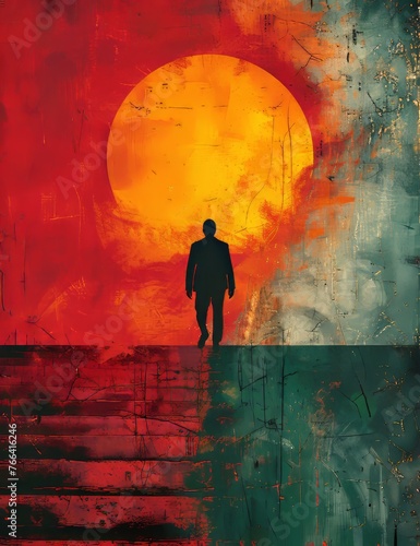 © wayne, Obraz premium Solitary Figure Before a Vibrant Sunset on Textured Background