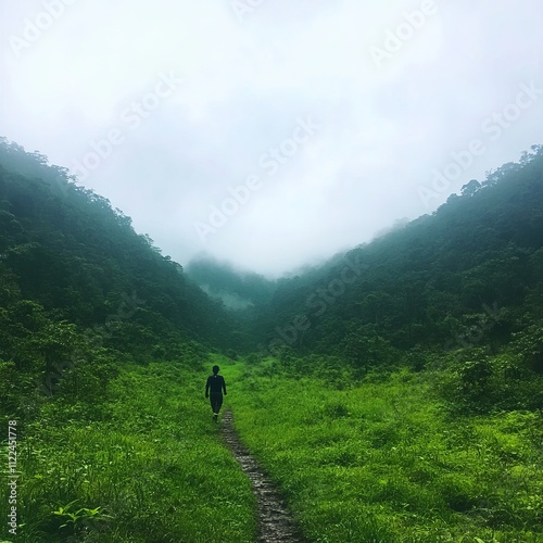 © Big9869, Obraz premium Solitary figure hiking verdant mountain path shrouded in mist.