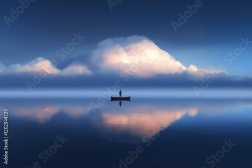 Fototapeta premium Solitary Figure in a Boat on Calm Waters Under a Cloudy Sky