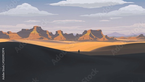 Fototapeta premium Solitary Figure in a Vast Desert Landscape with Dramatic Rock Formations at...
