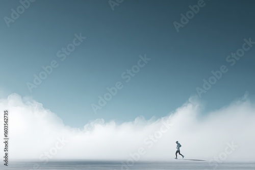 Fototapeta premium Solitary figure running through misty landscape under a vast, blue sky...