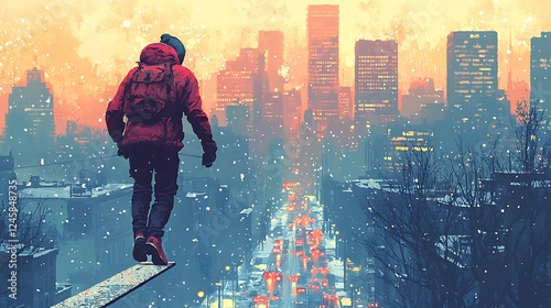 Fototapeta premium Solitary Figure Walking on a Snowy City Rooftop at Sunset.