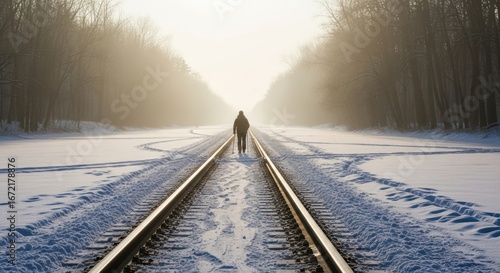 © Tetiana, Fototapeta premium Solitary figure walking on snow-covered railway tracks in winter landscape