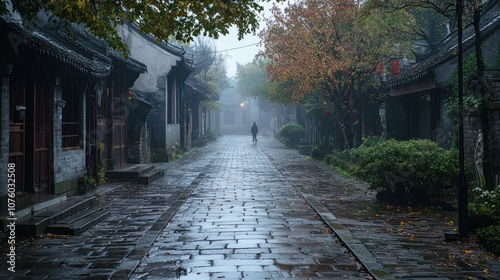 Obraz premium Solitary Figure Walking Through a Misty Chinese Alley