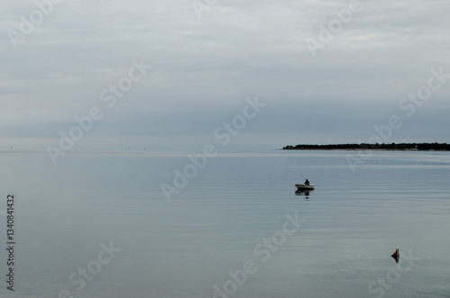 © Tomas, Naklejka premium Solitary fisherman in a boat on a calm ocean