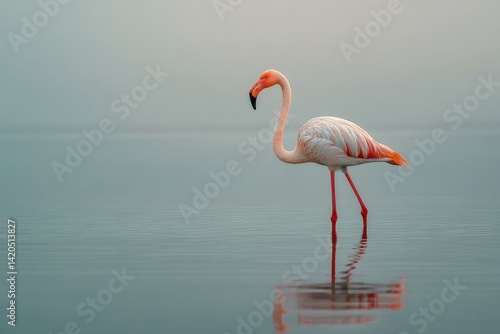© Роман Булатов, Obraz premium Solitary flamingo standing gracefully in calm water with soft pastel colors reflecting in a serene landscape
