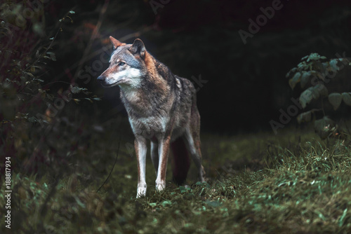 Naklejka premium Solitary gray wolf (Canis lupus) in dark forest. North Rhine-Westphalia, Germany