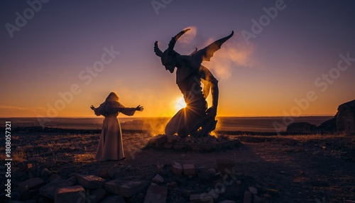© bluebeat76, Obraz premium Solitary Gregorian monk witnesses dramatic supernatural manifestation during golden hour desert meditation