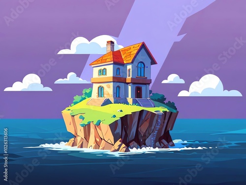 © SetCartoon, Naklejka premium Solitary House on a Clifftop Island