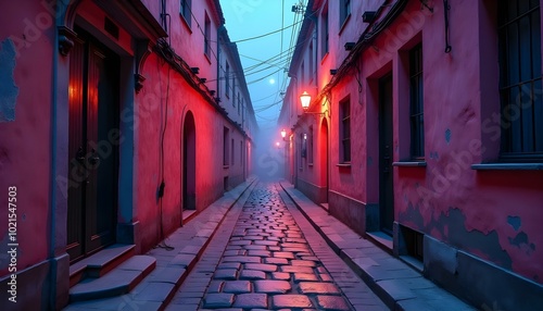 © sarahsophie, Fototapeta premium Solitary Medieval Stone Street Closed Doors and Windows, Dimly Lit Street Lamp Mysterious Danger