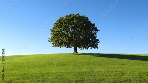 Obraz premium Solitary Oak Tree on Lush Green Hill Under Clear Blue Sky