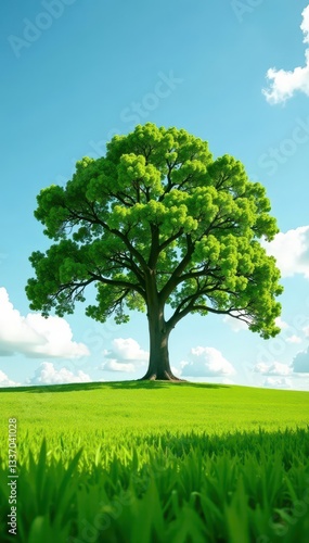 © tpadobestock, Obraz premium Solitary oak, vibrant green leaves, vast field , ecology, ancient, branch