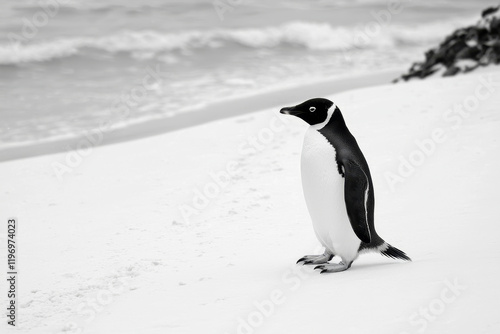 Fototapeta premium Solitary penguin on a white sandy beach, ocean waves in background.