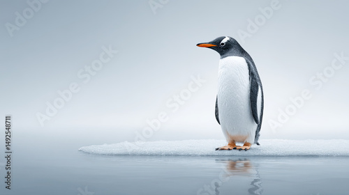 © AT10, Naklejka premium Solitary penguin stands on ice floe in calm water