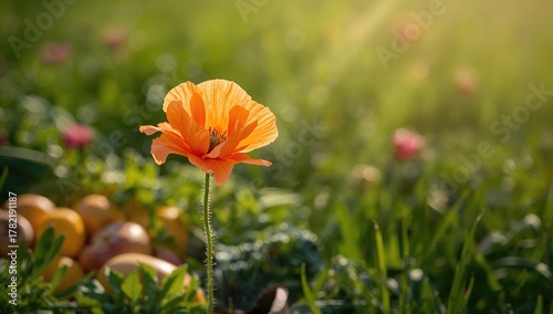 Naklejka premium Solitary poppy blossom amid a vibrant landscape, seasonal beauty, summer vibes