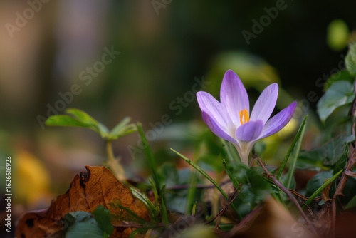 Fototapeta premium Solitary Purple Crocus Flower Blooming Among Green Grass and Fallen Leaves in...