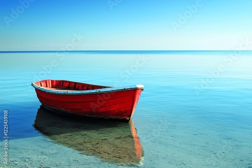 © Boragoo, Naklejka premium Solitary red boat gently resting on tranquil clear water under a bright sky