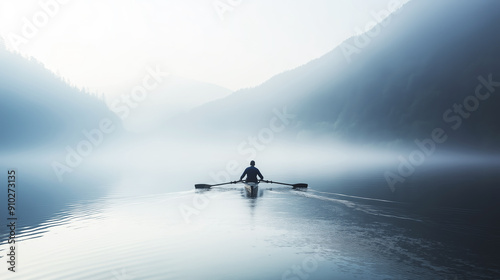 © Bonsales, Fototapeta premium Solitary rower on calm misty lake, surrounded by mountains, morning tranquility, serene landscape concept