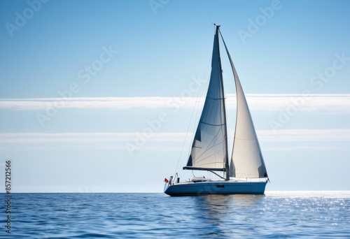 Fototapeta premium solitary sailboat gliding tranquil ocean waters under clear blue sky, sea,...