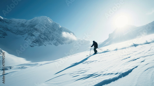 Naklejka premium Solitary skier is trekking across a snowy mountain landscape under a bright sun.