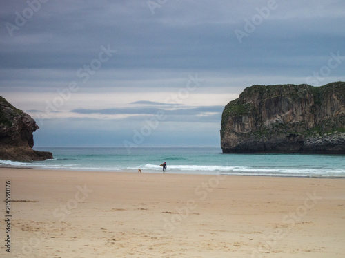 © sanedor, Fototapeta premium Solitary surfer going to surf on a beach