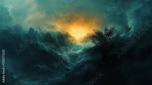 Fototapeta premium Solitary Tree Amidst a Stormy Seascape of Clouds
