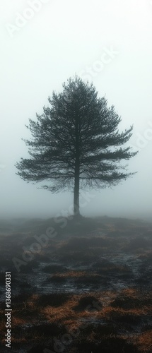 © Ali, Fototapeta premium Solitary tree fog shrouded moorland dawn