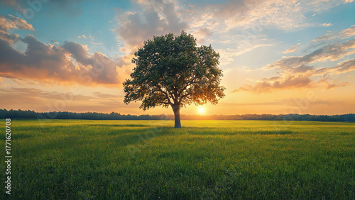 Obraz premium Solitary tree in a green field at sunset, symbolic of life after death,...
