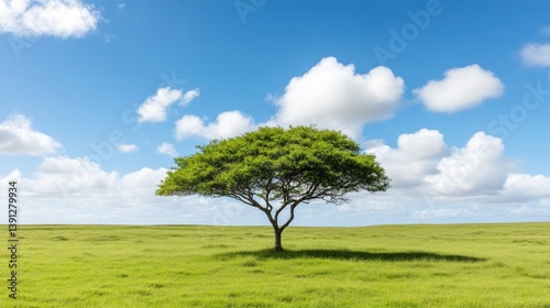 © Giman, Obraz premium Solitary tree in a vast green field under a vibrant blue sky