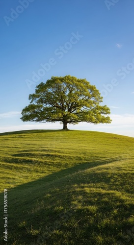Fototapeta premium Solitary tree on a hill under a clear blue sky creating a serene scene