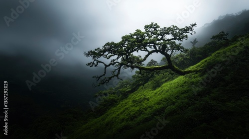 © Outkast, Obraz premium Solitary tree on a lush hillside with fog rolling in. Nature background use
