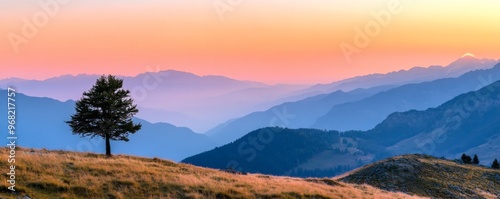 Obraz premium Solitary tree on mountainside at sunrise, panoramic view. Tranquil nature and...