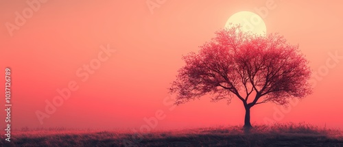 © Suradet Rakha, Fototapeta premium Solitary tree silhouette, soft pastel sky, delicate minimal branches, serene atmosphere, tranquil nature scene