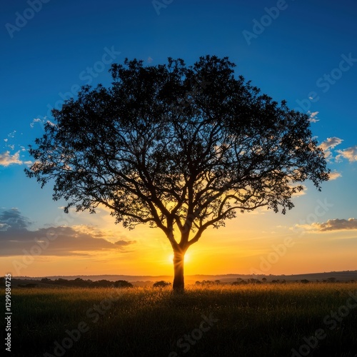 © harryaishi, Fototapeta premium Solitary tree silhouetted against a vibrant sunset over a grassy field.