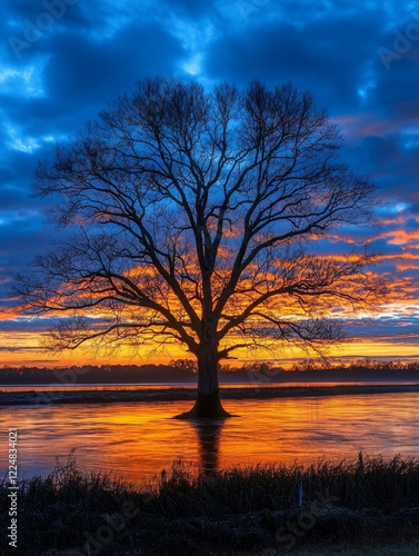 © watz, Fototapeta premium Solitary tree silhouetted against a vibrant sunset reflected in tranquil waters.