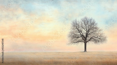 Fototapeta premium Solitary Tree Standing Amidst a Serene Landscape Under a Beautiful Soft Colored Sky at Dawn or Dusk in a Peaceful Countryside Setting