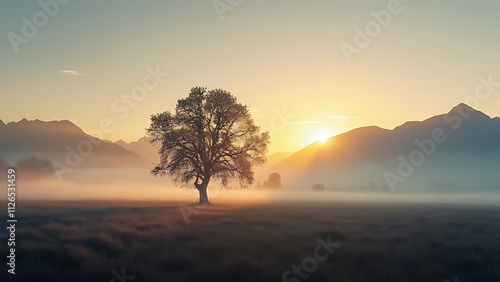 Fototapeta premium solitary tree stands in vast field at sunrise, surrounded by misty mountains