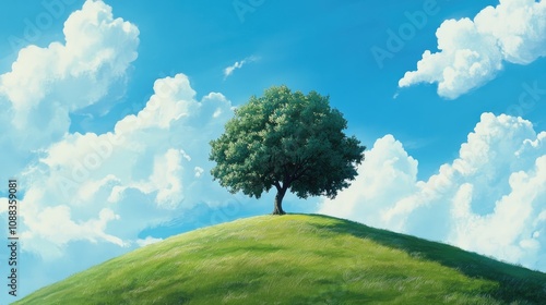 Obraz premium Solitary tree stands proudly on a lush green hill beneath a vibrant blue sky adorned with fluffy white clouds.