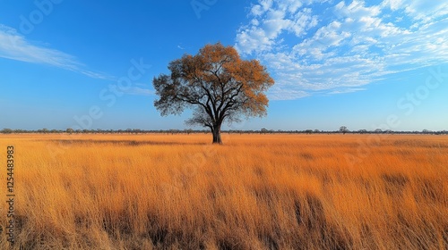 Fototapeta premium Solitary tree stands tall in golden grassland under a clear blue sky with scattered clouds