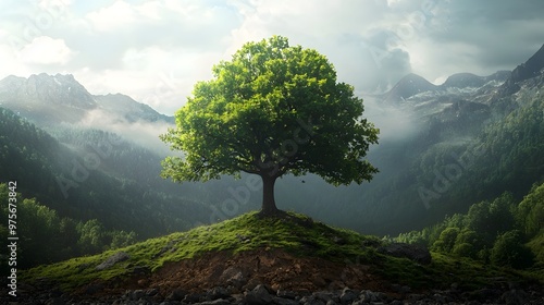 © Chalit, Obraz premium Solitary Tree Stands Tall in Serene Mountain Landscape Symbolizing Conservation Efforts