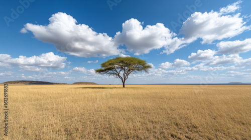© siraphol, Obraz premium Solitary tree stands vast savanna plain bright blue sky with fluffy clouds. scene evokes sense